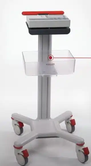 Schiller Cardiovit AT-1 G2 gemonteerd op een verrijdbare trolley met plastic bakje.