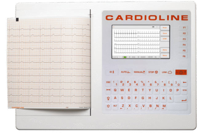 Cardioline ECG200+/ECG200S bovenaanzicht, rust ecg, 12 kanaals ecg met A4 printer