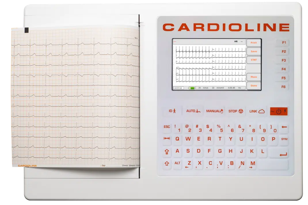 Cardioline ECG200S bovenaanzicht, rust ecg, 12 kanaals ecg met A4 printer en toetsenbord