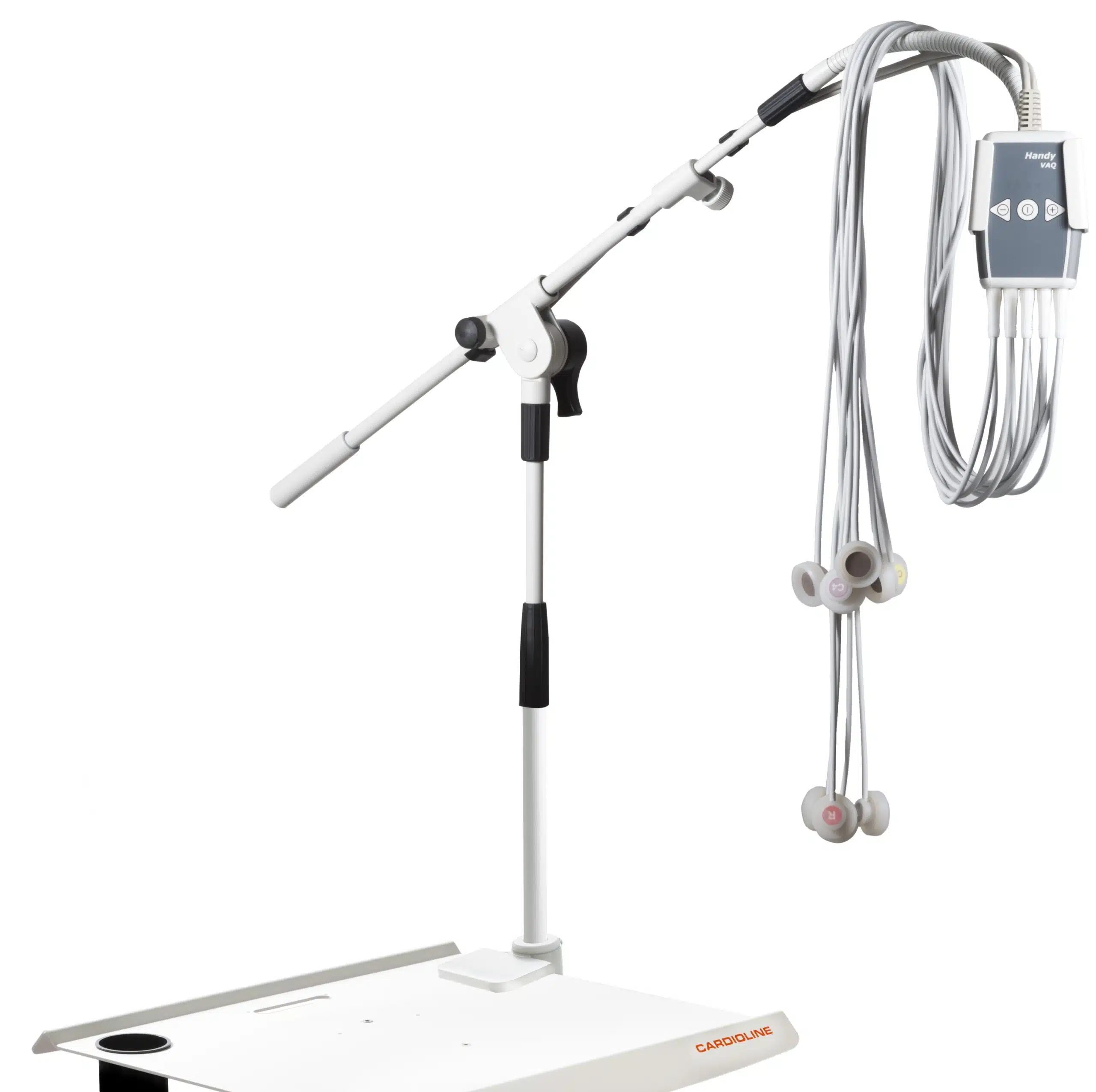 Het Handy VAQ vacuüm ecg kabelsysteem, om de ecg elektroden te bevestigen, is een snelle en eenvoudige manier om de patiënt voor te bereiden in elke situatie waarbij de kwaliteit van het ecg signaal voorop staat. De rustige, krachtige en onderhoudsvrije pomp is direct geïntegreerd in de compacte behuizing. De Handy VAQ heeft antislip inzetstukken waardoor het apparaat eenvoudig met één hand te bedienen is. Dit indrukwekkende systeem is dankzij het compacte ontwerp voor verschillende functies geschikt. Met de eenvoudige en gemakkelijke drieknoppen bediening kan de zuigkracht op vijf niveaus worden ingesteld. De plug-in kabels kunnen eenvoudig door de gebruiker worden verwisseld. Handy VAQ is een gebruiksvriendelijk, flexibel, alles-in-een apparaat dat het werk vergemakkelijkt. Toepasbaar in combinatie met alle CARDIOLINE cardiografen en stress test systemen. Voeding middels de bijgeleverde adapter of via een USB kabel. Inclusief geleidingsarm voor bevestiging op de CARDIOLINE universele trolley.